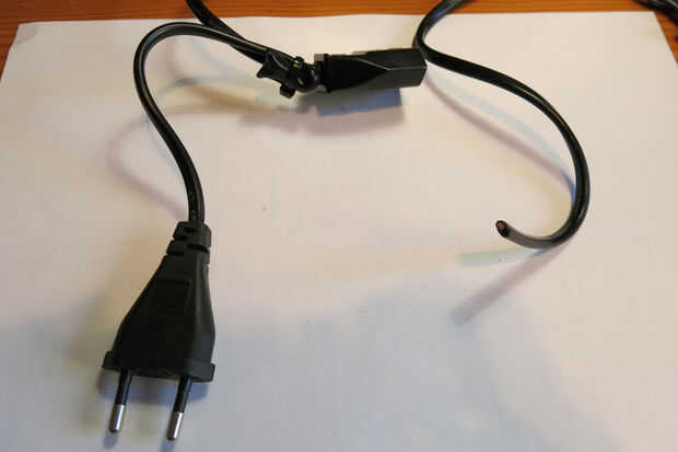 Unos 10 cm desde el enchufe macho corte la cubierta del cable para los cables.