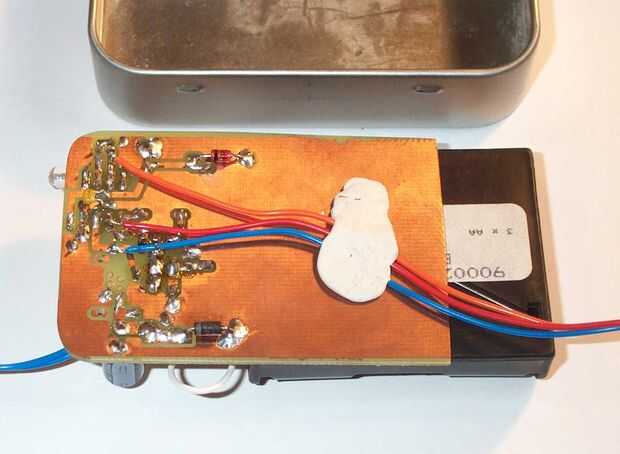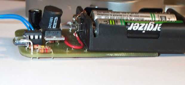 Un sostenedor plástico de la batería de la tienda de electrónica local se utiliza para contener las 3 pilas AA. Conduce se sueldan directamente a los clips. Se suministra corriente a la placa a través de los orificios del dos puente, flexibilizar la colocación de la batería. Una mejor solución podría ser una especie de agradables pinzas para montaje en PCB. No he encontrado estos.