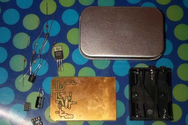 Esto fue una difícil PCB para el diseño. Hay espacio limitado en la lata después de que el volumen de 3 baterías del AA se deduce. El estaño utilizado no es una lata altoids genuino, es una caja de mentas de la promoción de un sitio Web. Debe ser aproximadamente el mismo tamaño que una lata altoids. Había no hay latas de Altoids a encontrarse en los países bajos.