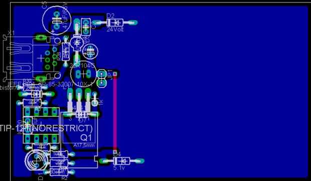 ** El águila tiene una restricción de enrutamiento en el paquete to-220 que interrumpe el plano de tierra. Usé el editor de la biblioteca para sacar la b-restrict y otras capas de la huella TIP121. También se podría añadir un cable de puente para resolver este problema si, como yo, odias el editor de la biblioteca de águila. Bobina del inductor y modificado a 220 huella están en la biblioteca de águila incluida en el archivo de proyecto.