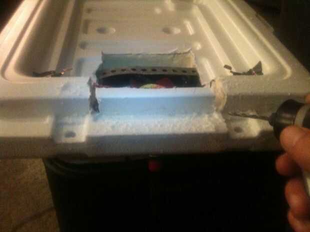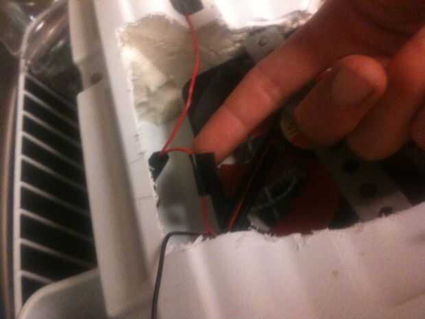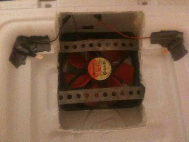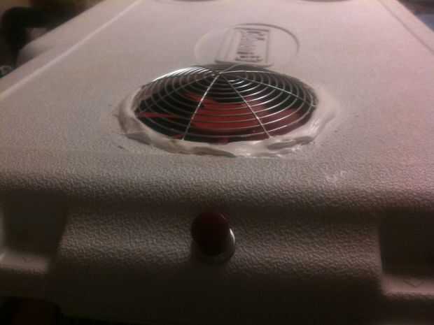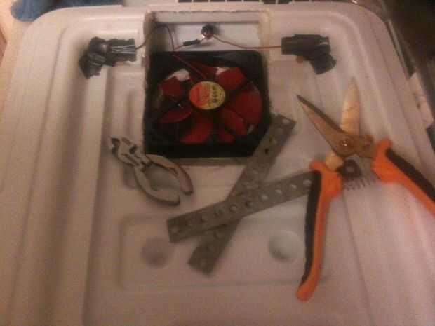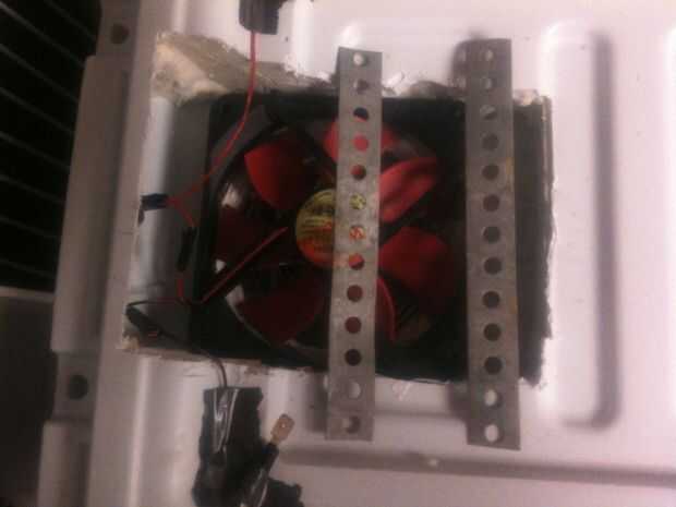 Encontrar una manera de fijar el ventilador. Como ves lo hice por simple deslizamiento unos cortes de metal a través del aislamiento.