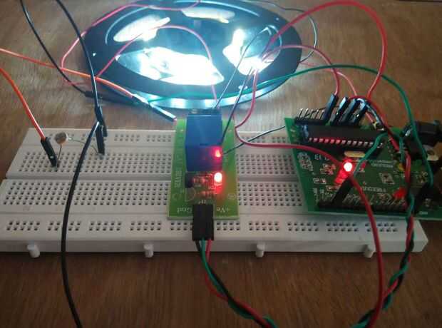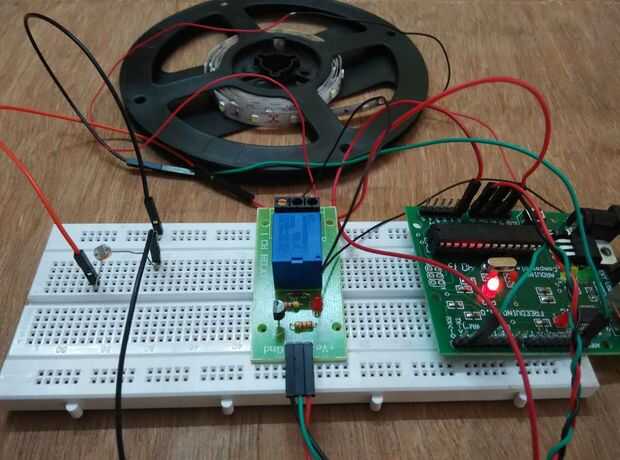 Aquí puedes ver el resultado Final. Cuando la luz ambiente es suficiente el relé y el LED de la tira son OFF. Y bajo condición oscura el relé, así como las luces de tira del LED están torneadas.