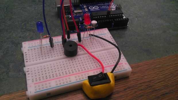 Este es un proyecto muy simple de Sugru para moldear y fijar el interruptor en un tablero de pan. Yo había construido policía luces y sirena utilizando un Arduino Uno, LED y un zumbador piezoeléctrico. Para activar o desactivar el timbre, pero mantener las luces encendidas, he añadido un interruptor como cierre de la conexión negativa. Sin embargo, el interruptor no fue asegurado a cualquier cosa, por lo que era un dolor realmente usarlo.