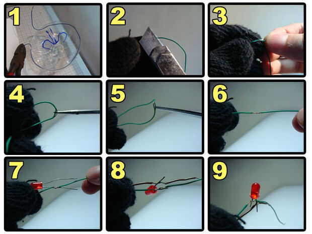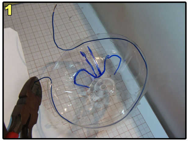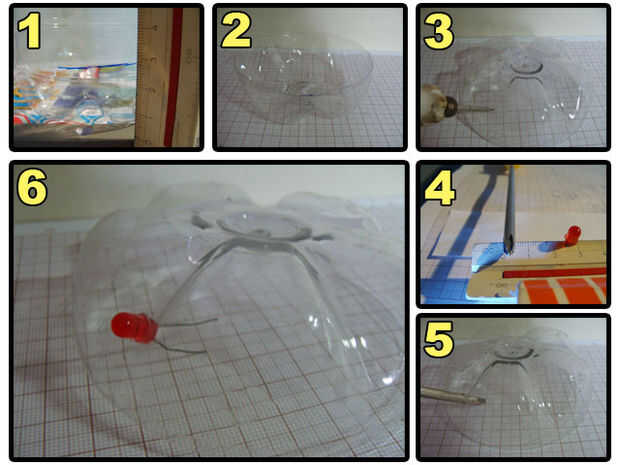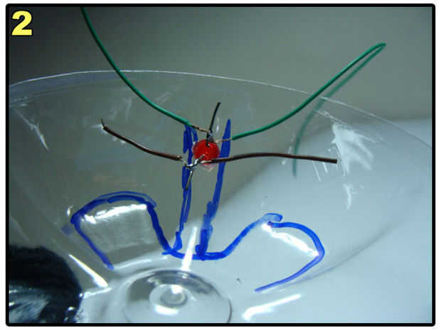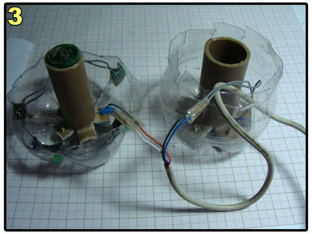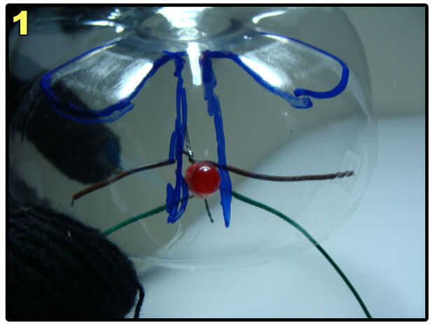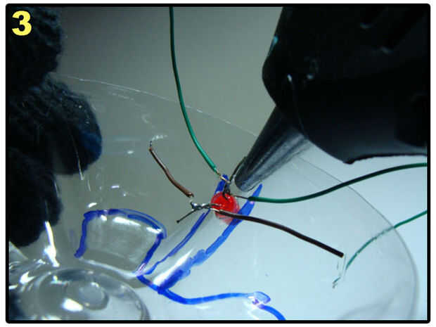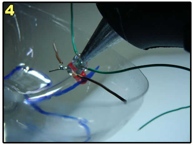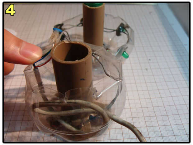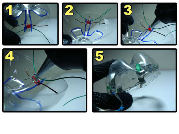 Make a hole on the bottle, pass the cable through it, connect two of the wires to switch and two of the wires to the LEDs. Anote las conexiones en un papel. El mío es: Naranja - polo positivo del LED verde. Blanco - verde LED borne negativo. Verde - Terminal del interruptor A. Azul - Terminal de interruptor de B.