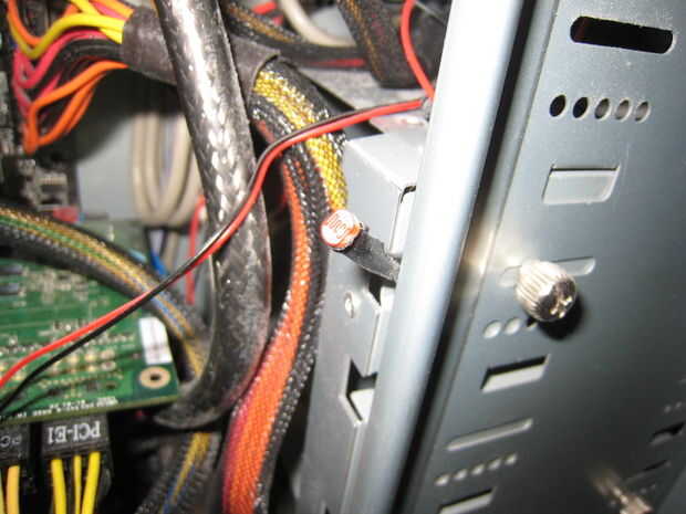 En pocas palabras: la fotocélula está conectada en un circuito divisor de tensión, resultando en un voltaje entre 0-5V aplicados a la clavija de entrada analógica de Boarduino dependiendo de la cantidad de luz detectada. El ADC a bordo da un valor numérico basado en esta tensión. Si ese valor cruza cierto umbral, el pin digital conectado a la Base del transistor se encuentra alta, se completa el circuito de interruptor de potencia de Motherboard, Tarjeta madre, y la computadora enciende (o apaga).