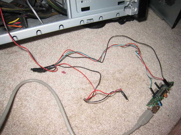 Nota: Los puertos USB en mi computadora funcionan como la fuente de alimentación está en (incluso si el equipo no está ejecutando). Esto proporcionó la energía necesaria para el Boarduino y permitió el circuito para funcionar. Pude correr el cable USB por la parte trasera de la caja y a un puerto USB libre. No es la mejor manera a la energía del circuito, que admitir. Espero tener una versión actualizada de este circuito que proporciona la misma funcionalidad de una manera más discreta. Más en eso más adelante.