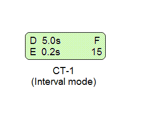 Una vez que los cuatro elementos son seleccionados y, presione el botón disparador para empezar a tomar fotos. El CT-1 toma fotos hasta que se pulse cualquier botón de la unidad - causando que deje de funcionar. Cuando se activa la unidad, la pantalla mostrará 3 valores diferentes (véase el cuadro abajo). El valor de D es el retardo entre cuadros - el valor de E es el tiempo de exposición y el valor de F es el contador.
