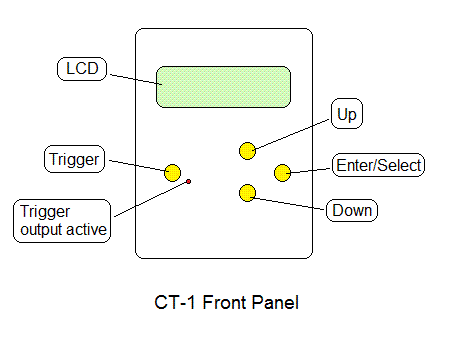 Trigger - disparador se usa para iniciar cada función. Cuando se seleccionan los intervalos, el Sensor o el Manual, gatillo provoca la unidad ejecutar la función basada en los ajustes que se hicieron a la unidad. Por ejemplo, en modo de Sensor, una vez que se elige el borde y el umbral se selecciona, pulsando el gatillo hará que el CT-1 empezar a mirar la entrada del sensor y dispara la cámara basada en las lecturas de corriente. En modo de configuración, el botón de disparo no tiene función.