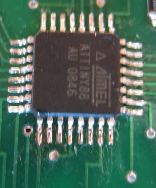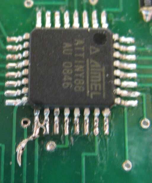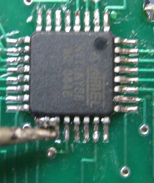 Pone el soldador en los pernos como se muestra en la segunda foto. Una vez que la soldadura fundida, golpee el borde de la Junta sobre su mesa de trabajo algo firmemente. El primer grifo se muestra en el cuadro 3 - la bola de la soldadura se ha ido desde el pin 3, pero se sigue tendiendo un puente sobre el 1 º y el segundo. Por lo tanto, calor las clavijas hasta el grifo de nuevo, otra vez, y el resultado se muestra en el cuadro cuatro.