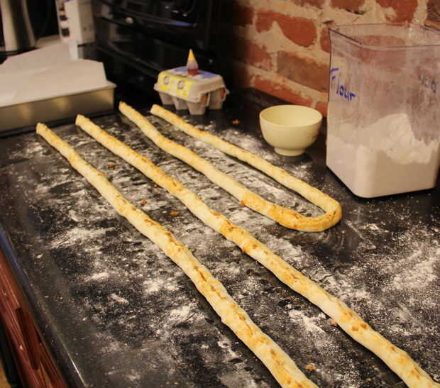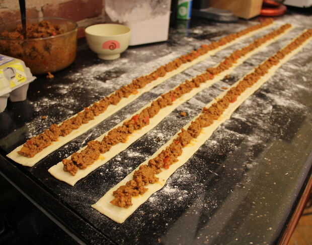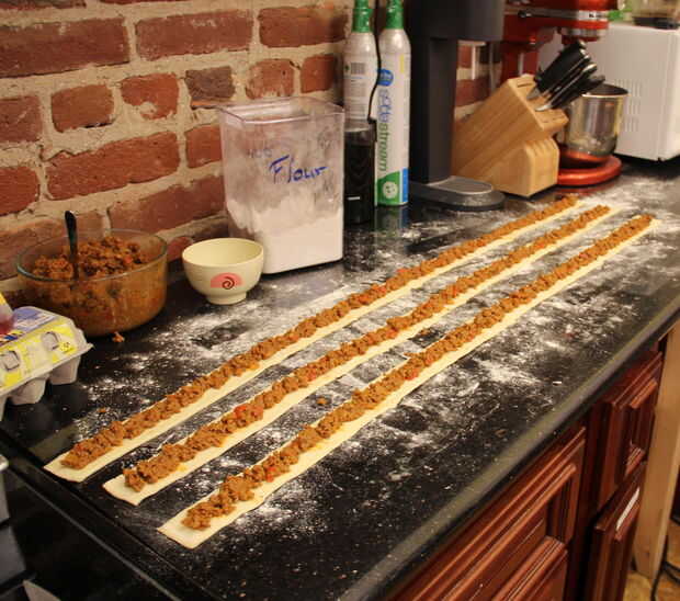 A partir de un extremo de la tira, estirar la masa ligeramente en el relleno y presione los bordes de la masa para cerrar para arriba. No agregar agua a esta costura o daremos vuelta en un lío grande - confía en mí!