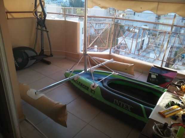 ser en la experimentación con la construcción de barcos de vela, he decidido empezar con un barco de vela de muy bajo presupuesto. Así que utilicé mi kayak inflable para ahorrar el dinero. El mayor problema era hacer kayak bastante estable y la única manera de hacerlo era mediante la adición de dos grandes pontones hechos a mano para los estabilizadores. el material utilizado para el pontón fue pvc cubierta la tela 0,5 mm (utilizado también para tienda y revestimiento de camiones).