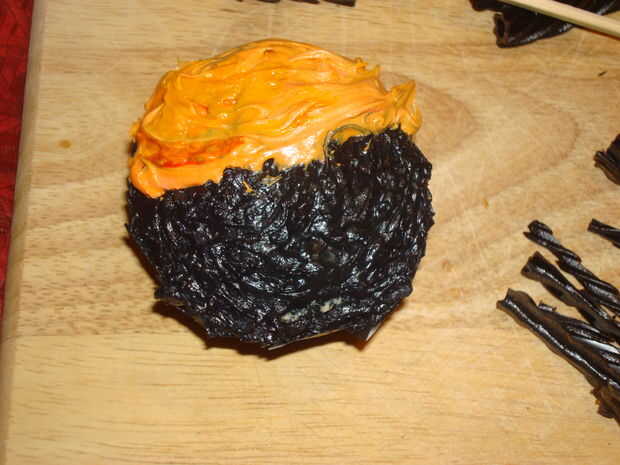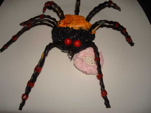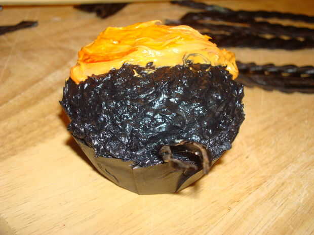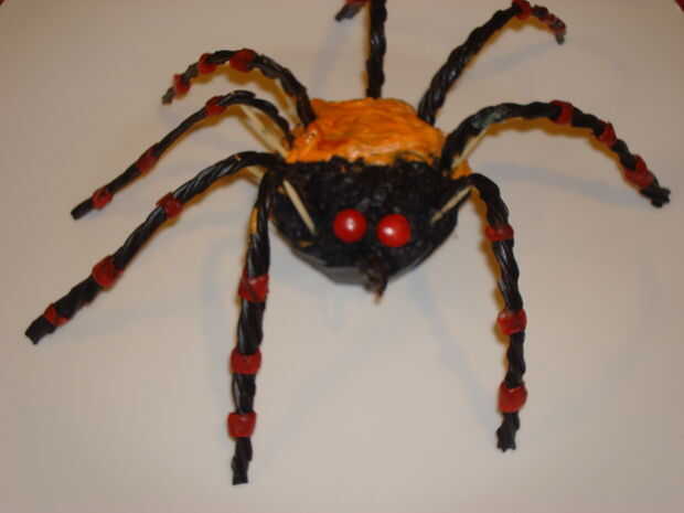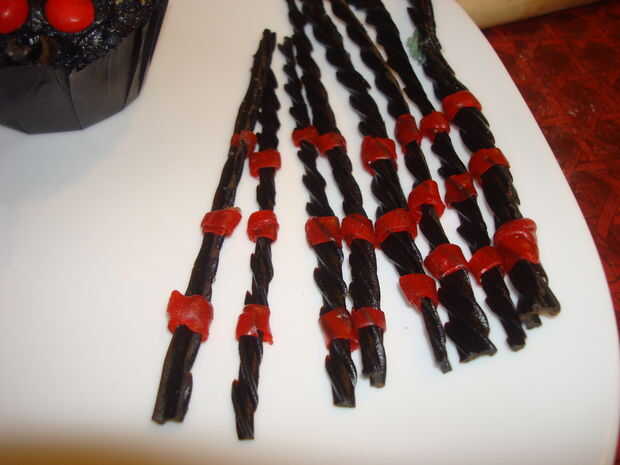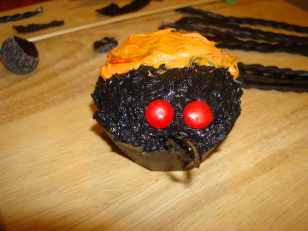 Nota: Cuando utilice el regaliz para las patas de araña he intentado cortar el regaliz por la mitad dejando una pequeña porción a hacer sólo 4 agujeros de pierna y pegarse el regaliz 1 split en los agujeros de la pierna. Luego arreglé las piernas para un aspecto natural. Pensé que este método funcionado muy bien. Usted tendrá que decidir cómo desea hacerlo. Ayuda a agregar las piernas justo antes de servir porque si consigue demasiado calientes las piernas pierden su forma. Frío Mis magdalenas en un recipiente cubierto con las piernas sobre ellos pero ocupan mucho espacio de esa manera.