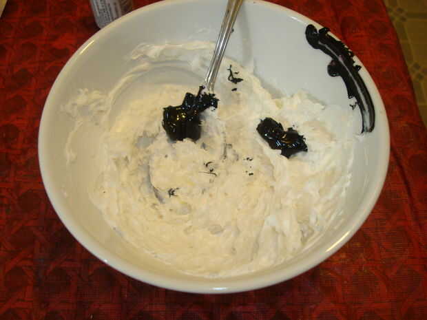 - Mezclar el colorante negro en el vaso restante para el glaseado negro.