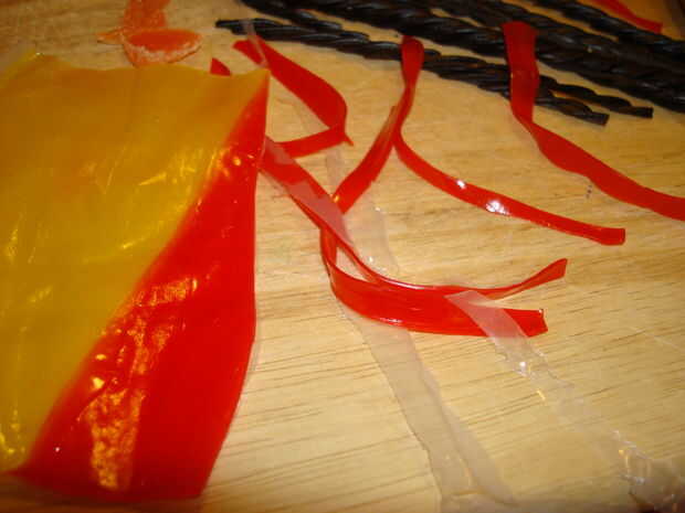 - Cortar los Ups de rollo de fruta roja en tiras para las rayas rojas en las piernas.