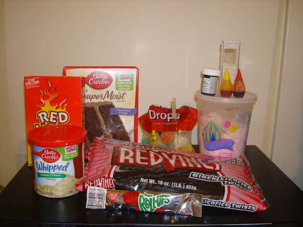 - Cualquier sabor llano cupcakes, glaseado blanco, gotas de goma, Red Hots, algodón de azúcar, granas de perla, rojo, amarillo y negro para colorear alimentos, regaliz, Red Fruit Roll Ups, coco, tijeras de cocina, diente selecciones, negro o naranja papeles pintados/capa y un pincho.