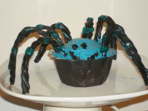 Cualquier sabor llano cupcakes, glaseado blanco, colorante azul, azul o negro gotas de cupcake liners, regaliz, negro goma, tijeras, pincho.