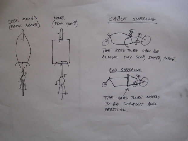 Los cuadros adjuntos muestran la geometría de la bicicleta y algunas ideas sobre los cambios de diseño que puede hacer si usted va con cable de dirección en el lugar de la barra de dirección. Elegí la barra de dirección y un diseño muy rectilíneo - esto funciona particularmente bien con cañas de bambú. Si he usado acero que quisiera definitivamente agrega algunas curvas porque las curvas son bonitas. Las bicis de Josh Muir son obras de arte.