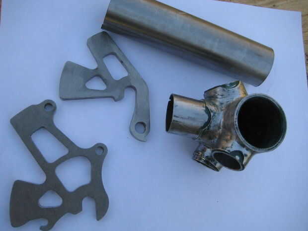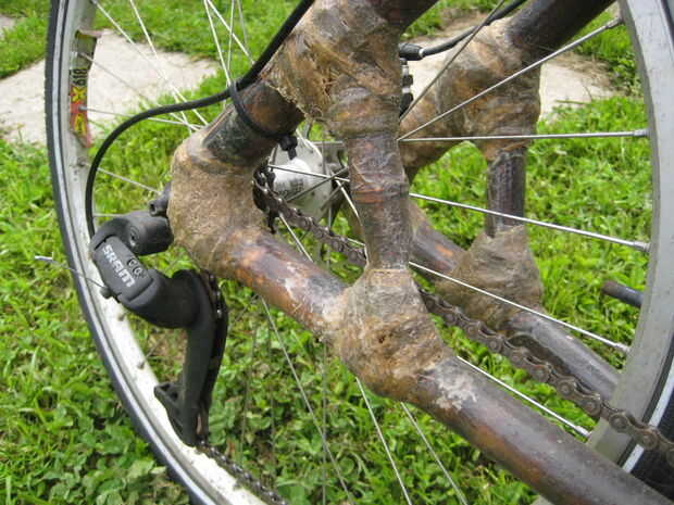 De la superficie de rodamiento deben ser metal - los dos auriculares y tija de sillín. El tubo de dirección hacia adelante es todo el metal. El tubo de dirección que el manillar es de bambú con tubos metálicos que se ajustaron en la parte superior e inferior. Para obtener los tubos metálicos que se ajustaron en su lugar envuelve cinta adhesiva alrededor de la horquilla para mantenerlo centrado cuando virar los tubos en lugar.