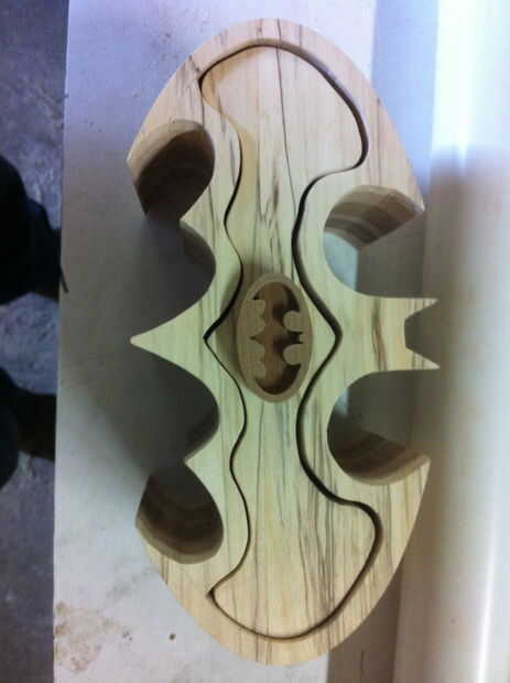 En este punto el cuadro está casi completo! Ahora sólo necesita un tirón de cajón. Decidí hacer mío pero se puede comprar. Dado mi tema me decidí a hacer la señal de Bat para la mina. Para ello había reducido abajo el logo de batman, imprime y aplicados a una pieza de madera. Luego, utilizando una sierra corte con cuidado el interior forma de murciélago. Una vez completado, pegué una madera contraste más oscuro en la parte posterior de la que solo corte (para darle ese efecto de la señal de murciélago).  Me les sujeta a y dejarlos curar durante la noche.