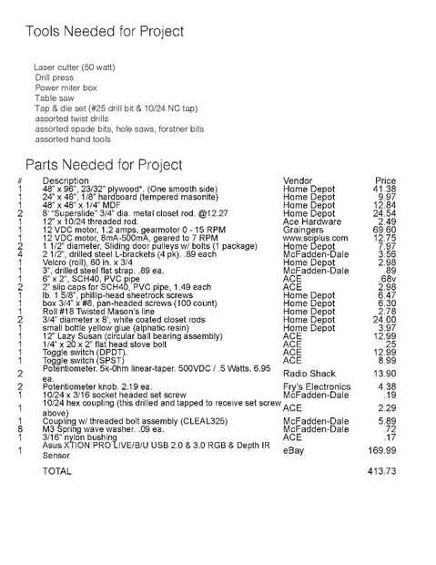 Las herramientas necesitan para este proyecto incluyen: cortador del Laser (50 vatios), prensa del taladro, potencia, caja de mesa, Sierra Tap & die (broca #25 y grifo de NC 10/24) surtido de brocas helicoidales, brocas de pala surtidos, sierras, brocas forstner y surtidos de herramientas de mano