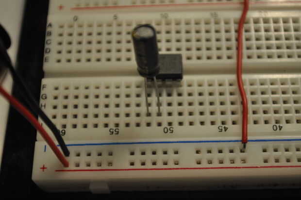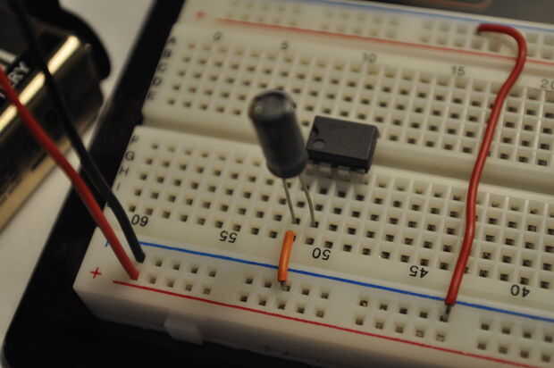 Conecte el condensador de forma que el positivo está en la misma columna como pin2 del Temporizador 555 y el plomo negativo está en la misma columna como pin1 del Temporizador 555.