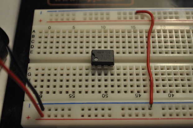 Conecte un cable jumper corto del pin1 del Temporizador 555 para el bus negativo (tierra) en el tablero de pan.