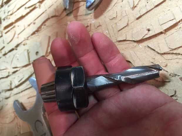 5. Coloque la nueva fresa en la boquilla lo suficientemente alta para captar una porción significativa de la caña - la nueva fresa puede (pero no es necesario) palo de la parte posterior de la pinza cuando correctamente colocado (ver foto). Para fresas más pequeño, empuje la fresa en el portaherramienta de 1/8 "desde el principio de la hélice.