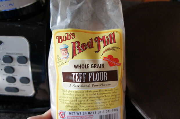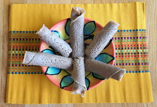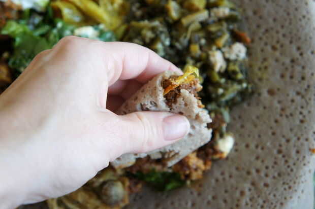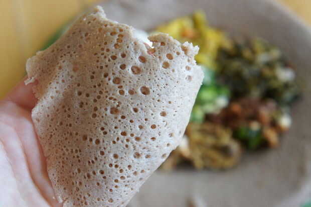 En lugar de utilizar utensilios, los etíopes utilizan una esponja como pan plano llamado injera, para sacar su comida con sus manos. Injera está elaborado con harina de teff y se cocina en una plancha a la consistencia de un pan plano fino. Es un poco como un crepe pero no está basado en el huevo y es más como una tortilla delgada. El ingrediente principal, teff, es una hierba antigua originalmente cultivada en Etiopía y cree que es el grano mas pequeño del mundo. Aunque pequeña, está lleno de nutrientes. Es rico en calcio, hierro, cobre aluminio, bario, tiamina--y es libre de gluten. Teff ahora también se cultiva en los Estados Unidos.