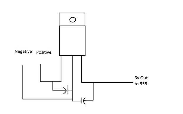El circuito de alimentación se utiliza para alimentar el circuito. Necesita por lo menos una batería de nueve voltios y un regulador de voltaje. Te recomiendo conseguir varios de ebay porque recaliente al dibujar demasiada corriente. No entraré sobre cualquier cosa para el regulador de voltaje ya que resulta bastante complicado. Todo lo que necesitas saber es que (1) es donde pones el cable rojo o cable positivo, (2) es donde se puso el negro o tierra a, y (3) es donde su hacia fuera-poner proviene o regulada de tensión.