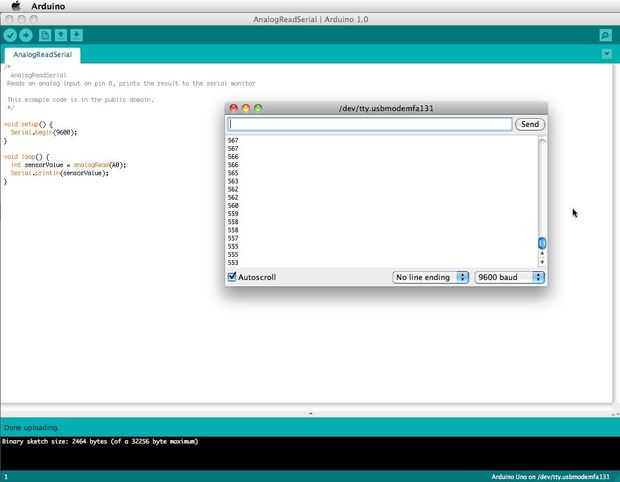 Por ejemplo, conectar barrido centro (pin central) de un potenciómetro a A0 y las clavijas exteriores, respectivamente, a 5v y tierra. A continuación subir el boceto que se muestra a continuación: