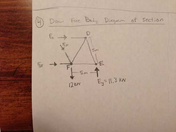 Ahora para resolver el interior las fuerzas actuando sobre cada viga, se debe utilizar un diagrama de cuerpo libre seccional. Para hacer este diagrama imagino corta las vigas CD, CF y GF en la mitad. Ahora dibuja un nuevo diagrama de cuerpo libre mediante triángulo FDE y las partes de las vigas restantes. Dibujan tres vectores de puntas en los extremos de las tres vigas que fueron cortadas. Etiquetarlos