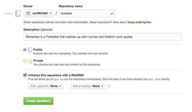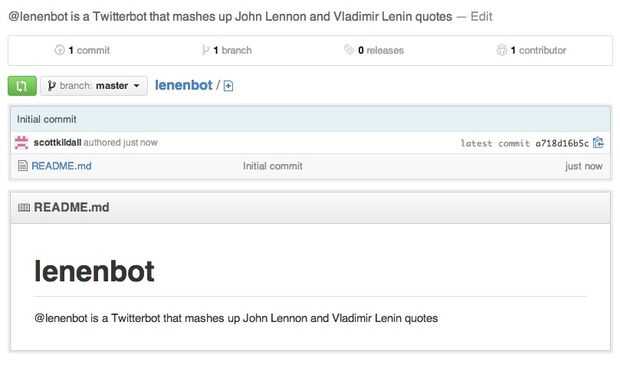 El código de ejemplo estoy usando aquí se llama lenenbot, que es un Twitterbot que mezcla a John Lennon con Vladimir Lenin cita. El primero se lleva la mitad de uno y se mezcla con la segunda mitad de otro.