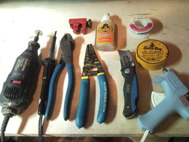 De cortador de alambre, Strippers. Soldador, fundente, soldadura. Tornillo de banco. Dremel. Cortador de tubos. Cuchillo para uso general. Pegamento del gorila Ayudar a las manos. (si tienes) Pistola de pegamento caliente.