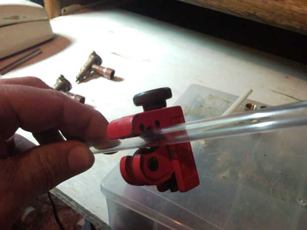 Utilizando el cortador de tubos muy suavemente cuenta el tubo de plástico, si se utiliza demasiada presión se agrietará y se rompe, la mejor manera de hacer esto encontré está marcando el tubo y luego calentar la lámina de cuchillo de utilidad y cortarlo. Limpie cualquier fresas.