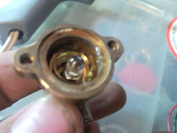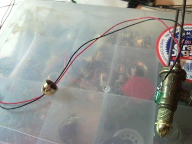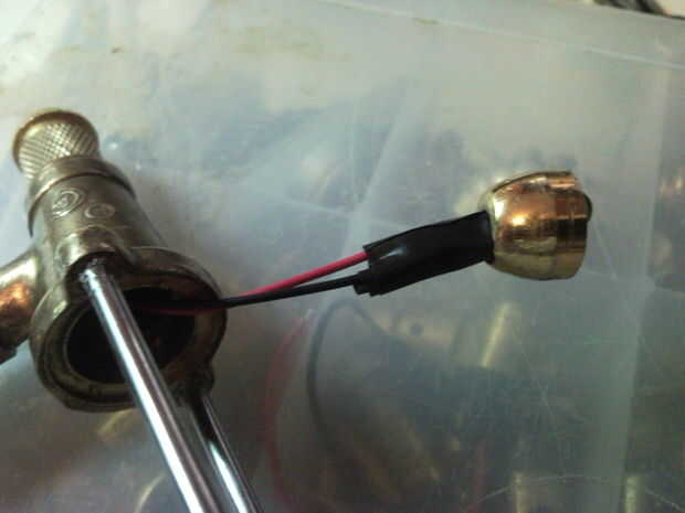 Primer lugar una de las tapas de puntero 2 laser pasadas en el cable por lo que se verá como un recipiente de latón dentro de la base, he utilizado pegamento caliente en este punto para sujetar el tapón en la base, el pegamento se seque más rápidamente entonces pude establecer en su lugar usé una pequeña antorcha encendedor calentar la base y derretirse el pegamento sin dañar el LED y vuelva a colocar la tapa.