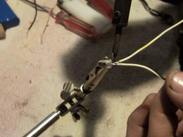 Muy bien tiempo para soldar el cable del LED, asegúrese de que usted tiene lo positivo y negativo correcto en ambos LED. Si es posible trate de usar los cables rojo y negro en caso de corte en él otra vez... Sólo hace más fácil y más rápido si hay una reparación para hacer o tal vez una remodelación...