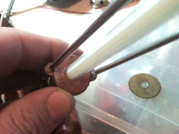 Usted puede tener utilizar la Dremel para moler abajo unos dientes en el engranaje para que no se unirá a las barras guía. Inserte el tubo en el LED run un anillo fino de pegamento caliente en la base, recuerda seca real rápido en latón para que se tenga que refundirlo calentando la base entonces prensa engranaje abajo Mantenga duro para buena 10 a 15 segundos y será sólido.