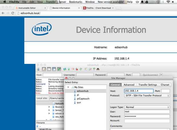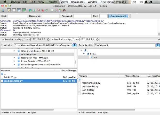 Cargar archivo de readingAnaloy.py en el Edison, utilizando a un cliente FTP FileZilla como se muestra en la tercera captura de pantalla.