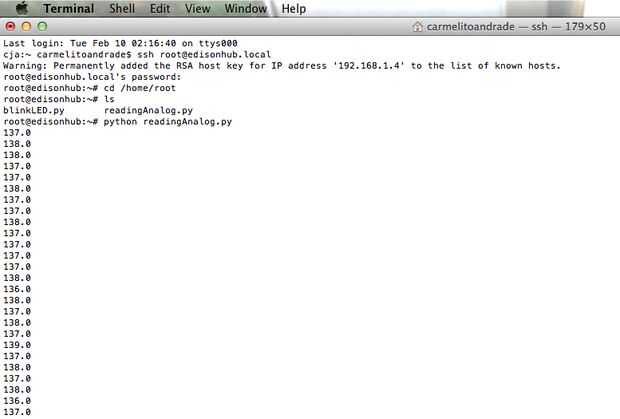 Ahora abra una nueva ventana de Terminal y SSH en el Edison usando el comando - ssh root