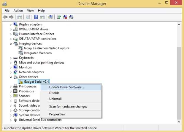 4. cuando nos conectamos a Galileo por primera vez tenemos que instalar a los controladores. En Administrador de dispositivos podemos ver que el dispositivo necesita un controlador, el dispositivo se presenta en otros dispositivos como Gadget Serial v2.4
