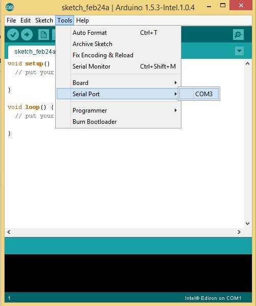 puerto serie correcto. Herramientas en Puerto serie Seleccione el puerto COM en el que Galileo está escuchando. Usted puede comprobar que desde el administrador de dispositivos.