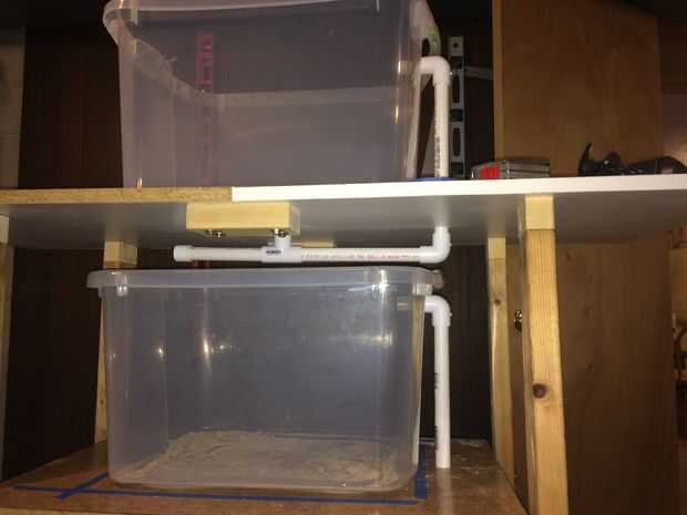 Lo primero que necesita hacer es asegurarse de que los contenedores caben en tu estantería seleccionada con sala por encima de los tanques de peces y sumidero para la plomería. Luego a preparar los recipientes para drenajes de desbordamiento.