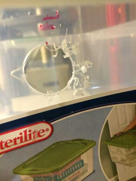 Para el tanque de pescados, perfore un agujero para el tubo de rebosadero una pulgada o dos por debajo de la parte superior del recipiente. Perforé como a la parte superior lo que pude, que fue limitado por el asa de la bandeja. Los drenes terminaron siendo aproximadamente 2,5 pulgadas por debajo de la parte superior del recipiente. Yo recomendaría perforar el desagüe de cama crece más baja si usted planea usar una flotante crece media (más en crece media más adelante). Esto reduce los medios de comunicación crece se derrame sobre la parte superior del recipiente. 3/4" PVC es ligeramente más grande que una pulgada de su diámetro exterior, por lo que 1" de la espada poco y algunas lijas deben ser la manera más fácil de obtener un calce apretado alrededor de la tubería.
