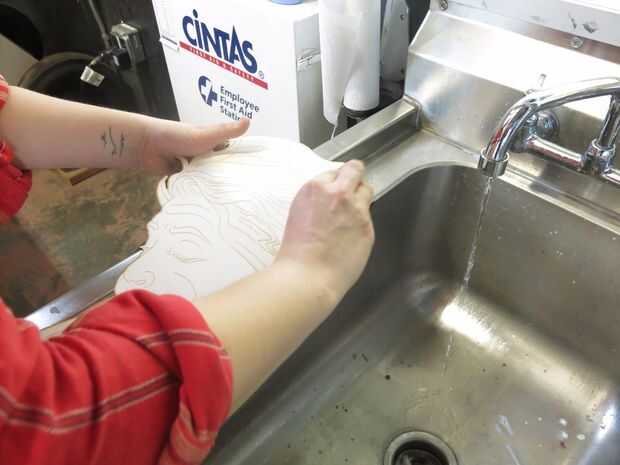 Ejecutar su papel de acuarela bajo un grifo con un caudal constante. Cepille suavemente el papel y las líneas de aguafuerte con las manos. Verá las líneas de haz visiblemente más claro.