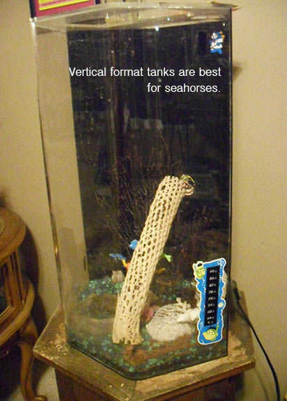 Tamaño del tanque: La altura mínima debe ser no menos de 18 pulgadas. El nuestro tanque de Caballito de mar (en la foto) era un acrílico 15 galones, tanque vertical con formato hexagonal que funcionó muy bien. Siempre nos dijeron que los caballitos de mar prefieren tanques de formato vertical, pero como hay espacio para vagar, ciertamente aprecian espacio horizontal también. Ambas direcciones son importantes para los comportamientos de cortejo.
