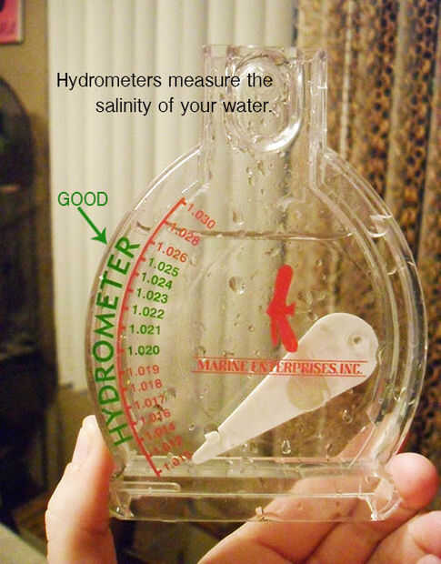 Si no tienes uno ya, necesitarás un densímetro para controlar peso específico. Para los nuevos en acuarios de agua salada, gravedad específica significa salinidad. Algunos peces como el agua más salado que otros. Caballitos prosperan en una SG de 1,021 1,024. Esto se puede medir simplemente con un dispositivo como se muestra en las fotos. Pala una muestra de agua de su tanque en el dispositivo y ver donde se coloca la aguja. Densímetros mayoría indicará la "zona buena", como se observa en el código de colores aquí. El he probado en la foto el agua es agua del grifo, que como se puede ver, no registra salinidad.