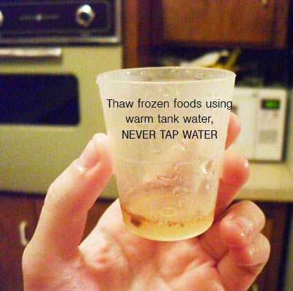 Los alimentos congelados se venden generalmente en paquetes de ampolla que se asemejan a las bandejas de cubos de hielo. Cada porción puede hacer estallar hacia fuera para descongelar en una taza pequeña Medicina plástica. Descongelar con el agua salado de su acuario. Nunca mezclar sus alimentos congelados con agua corriente para descongelar! Agua sólo contiene muchos componentes de misterio y no vale la pena contaminar su tanque.