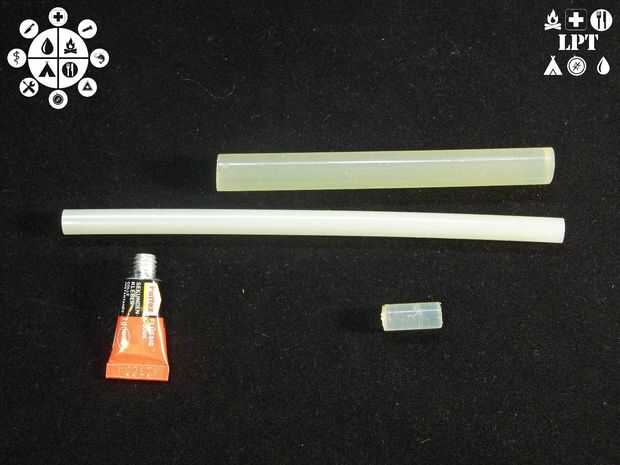 Pegamento o cianocrilato puede utilizarse para pegar permanentemente dos materiales juntos. Se puede usar para reparaciones, improvisación de armas y herramientas como pozos en cuanto a primeros auxilios se utiliza para cerrar heridas. Si desea obtener pegamento específico para ese papel de primeros auxilios recomiendo para invertir el dinero en médicos colas como Dermabond para evitar los efectos secundarios de superglues regulares.