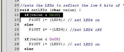 Desplácese hacia abajo hasta la primera línea de la función setLEDs (línea 22, ver imagen 1). Haga clic derecho en cualquier parte de la línea y selecciona "Toggle Breakpoint (código)". ¿Observa el punto rojo a la izquierda de esa línea de código? Puede hacer doble clic en ese margen a set/unset puntos de interrupción, así. (imagen 2) Un punto de interrupción es un punto de la en el código donde interrumpirá la ejecución del programa que permite depurar.