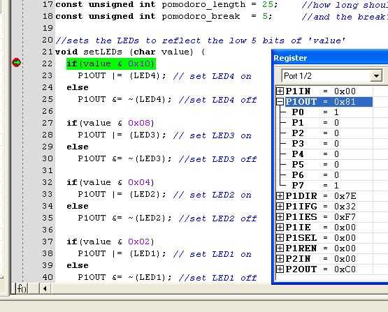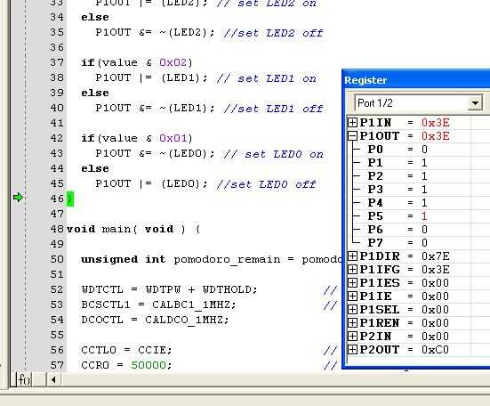 Puesto que esta función sólo se ocupa de una sola variable y sabemos que es correcto, vamos a cerrar la ventana de "locales". Ahora seleccione "Ver" → "registrarse" del menú. En la ventana "registro", cambiar el cuadro de lista desplegable para mostrar "puerto 1/2". Expanda el árbol de "P1OUT". (imagen 5)